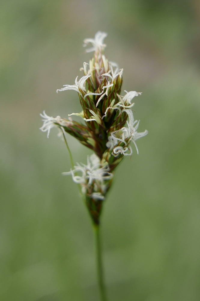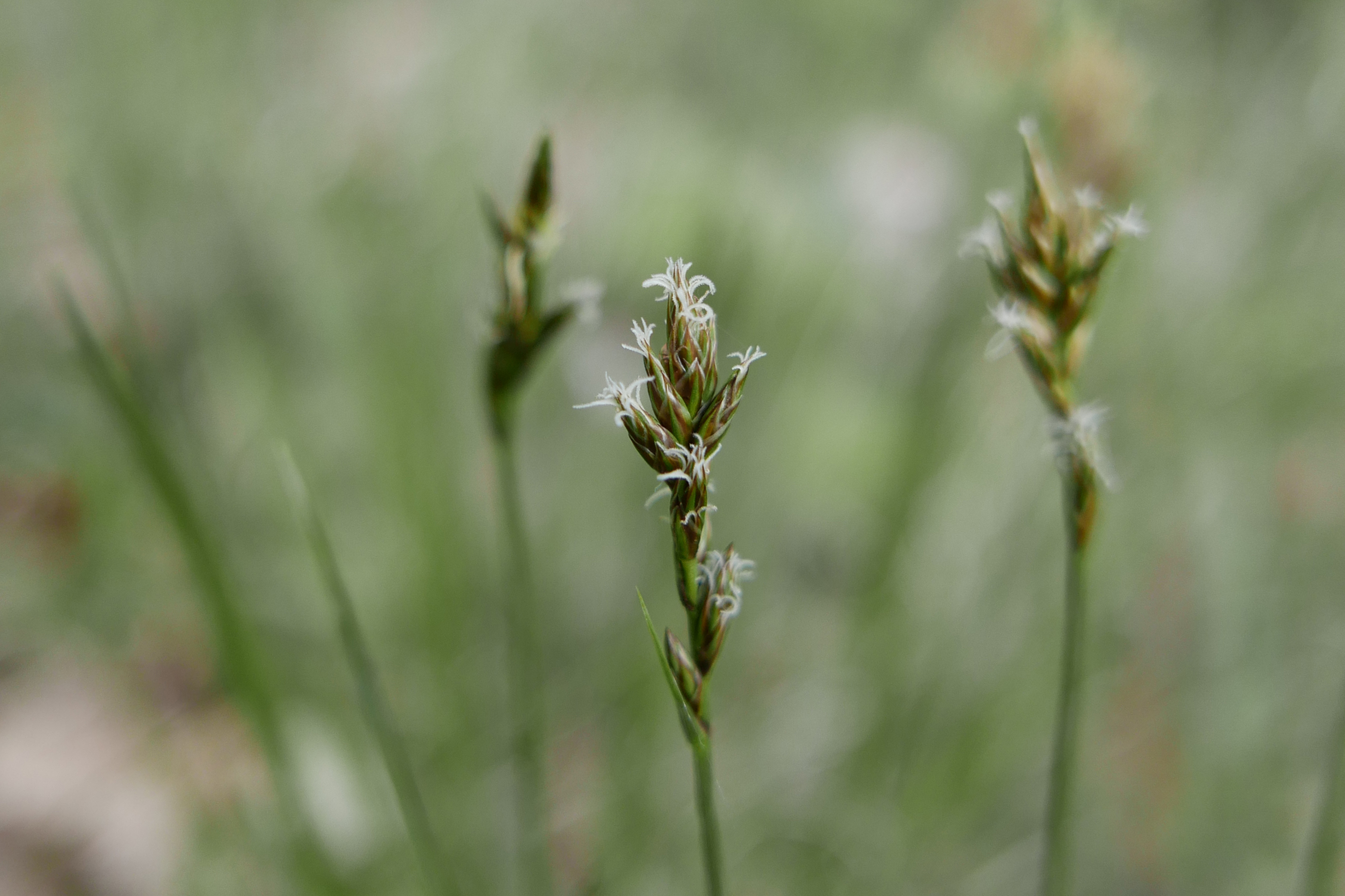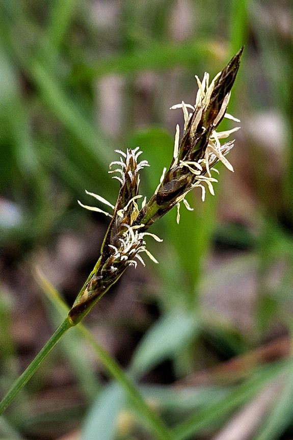 Van rivierduinzegge wist ik niet dat het bestond. Het wordt niet apart van zandzegge behandeld in mijn flora uit 1990 die ik van Ruud van der Meijden zelf heb gekregen en die ik trouw gebruik. Het wordt ook niet besproken in deel 5 van Weeda’s oecologische flora, onmisbaar als niet alleen de soort, maar ook de biologie je interesseert. Toen ik leerde van het bestaan kon ik tussen mijn foto’s van een wandeling langs de Overijsselse Vecht er een paar redelijk overtuigd thuisbrengen tot rivierduinzegge. Ondertussen heb ik het ook gevonden bij een stoplicht in Hardenberg. Je ziet op de foto’s dat de mannelijke bloemen onderaan in de aartjes zitten: het duidelijkste verschil met de zandzegge